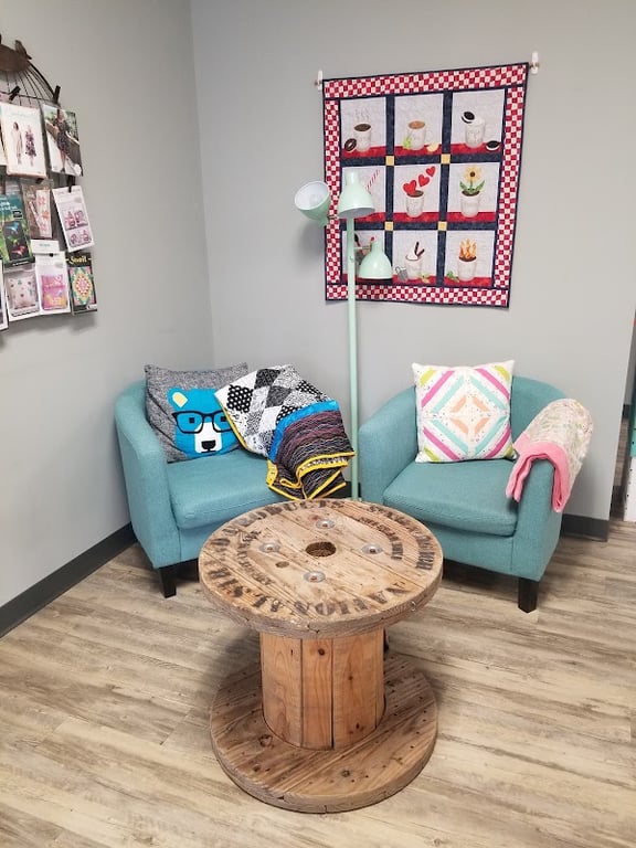 The image shows a cozy corner in Stitch Morgantown, featuring two teal chairs adorned with colorful pillows and a wooden spool table.