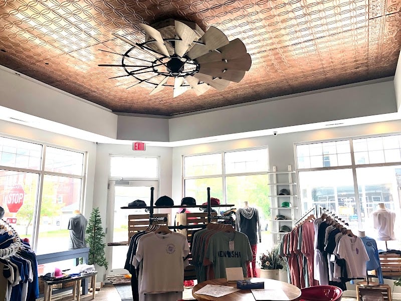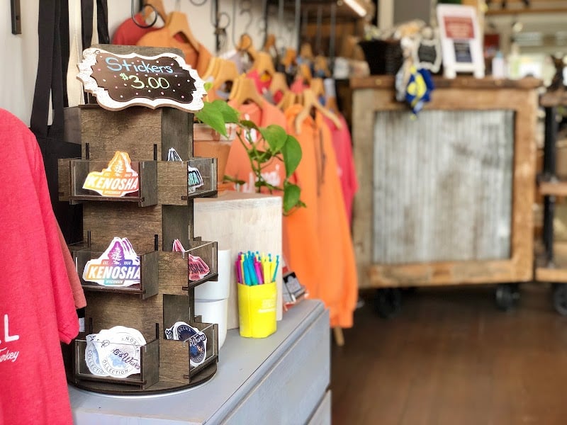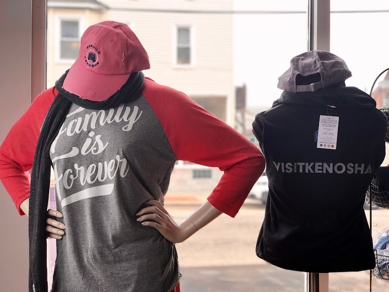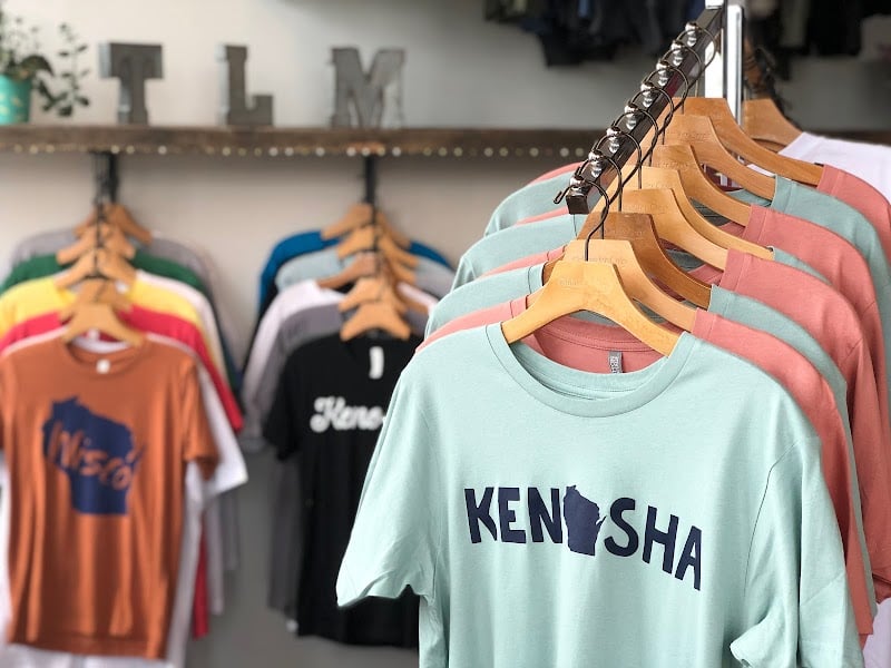 Colorful t-shirts featuring the word "KENOSHA" and various designs hang on wooden racks in a bright, inviting sewing store.