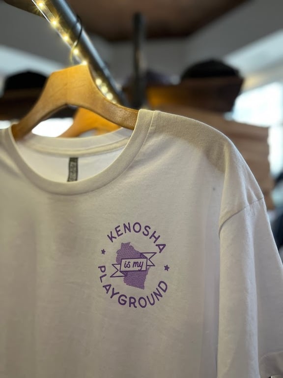 A white t-shirt featuring the phrase "Kenosha is my Playground" in purple is displayed on a wooden hanger.